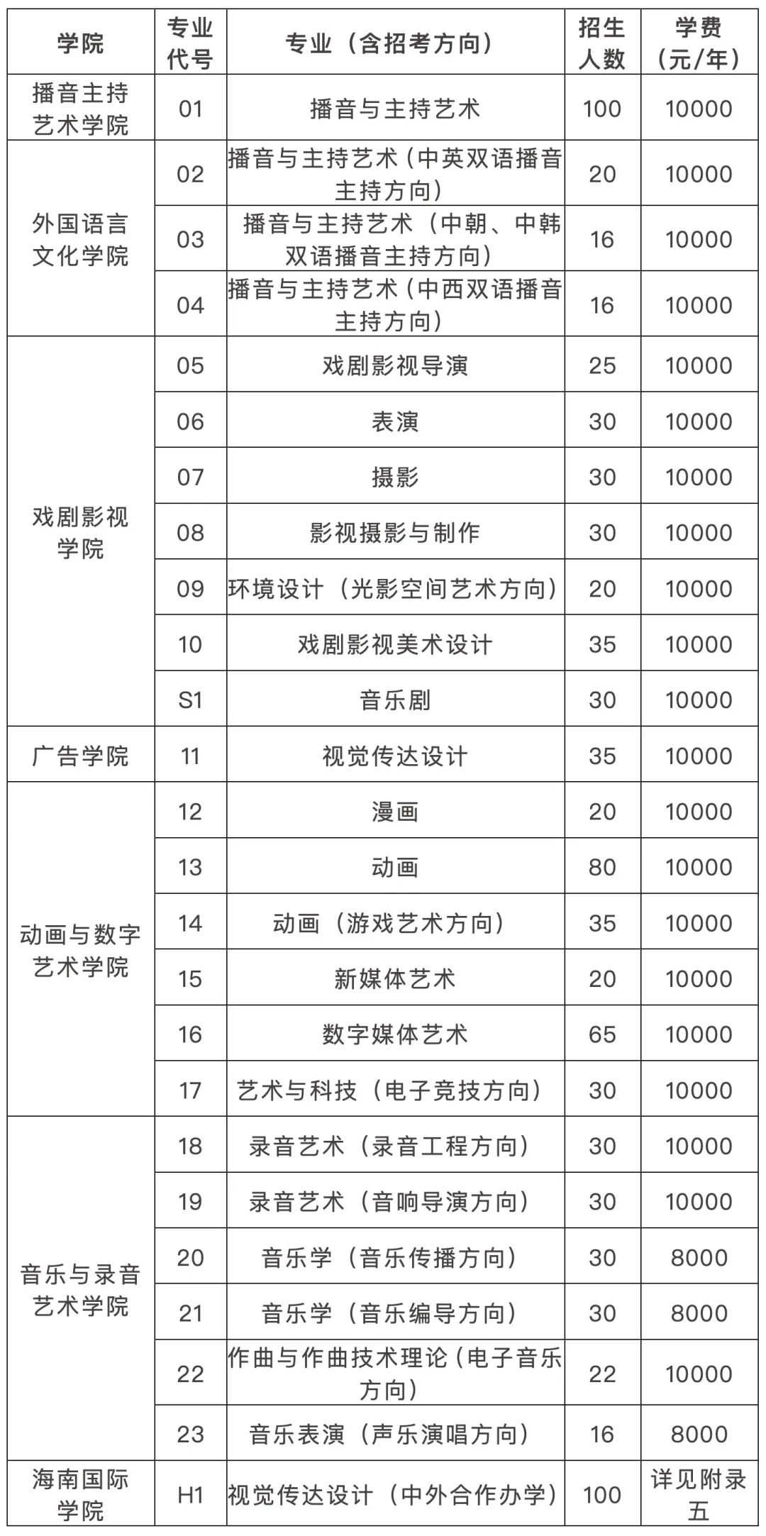 1. 报考我校播音与主持艺术、播音与主持艺术(中朝、中韩双语播音主持方向)、播音与主持艺术(中西双语播音主持方向)、表演、摄影、影视摄影与制作、戏剧影视美术设计、音乐剧、视觉传达设计、漫画、动画、动画(游戏艺术方向)、新媒体艺术、作曲与作曲技术理论(电子音乐方向)、音乐表演(声乐演唱方向)、视觉传达设计(中外合作办学)专业的考生,高考文化课成绩须达到生源所在省(区、市)普通类专业本科批次相应科类录取控制分数线(以下简称普通本科线),在此基础上,我校依据考生志愿,按校考成绩排名择优录取。校考成绩排名相同时,按考生高考文化课成绩÷生源所在省(区、市)普通本科线的比值从高到低择优录取。